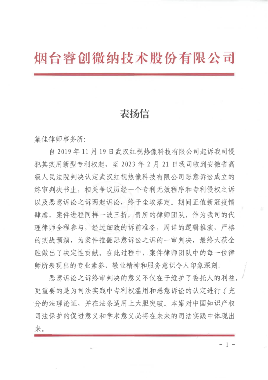 至此,睿创集团获得恶意诉讼案的最终胜利并且成功维护自身合法权益,也为睿创集团与武汉红视之间长达四年横跨整个疫情时代的系列诉讼纠纷画上了圆满的句号。