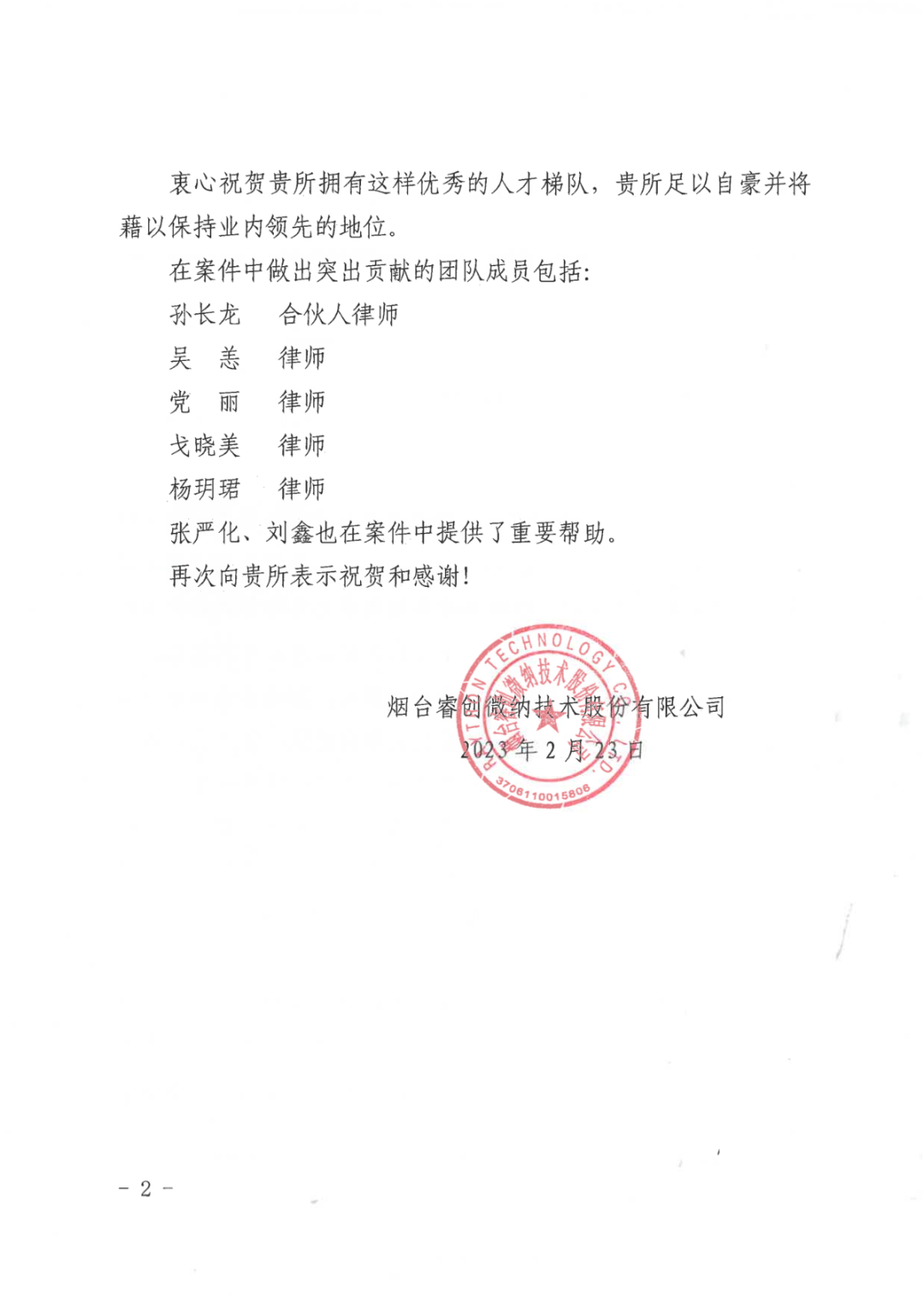 图1 睿创集团向雷速官网寄送的表扬信