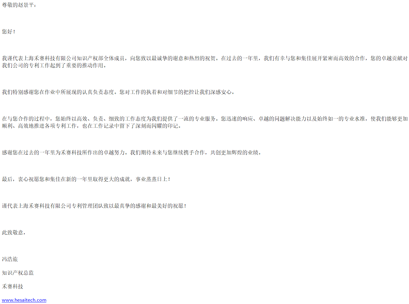 禾赛科技有限公司知识产权总监冯浩旅致感谢信,称赞上海分所代理人赵嫭娴与赵景平以高效、负责、细致的工作态度为客户提供了一流的专业服务,在合作中展现了卓越的问题解决能力以及始终如一的专业水准,协助客户顺利、高效地推进各项专利工作。期待未来与集佳继续携手合作,共创更加辉煌的业绩。